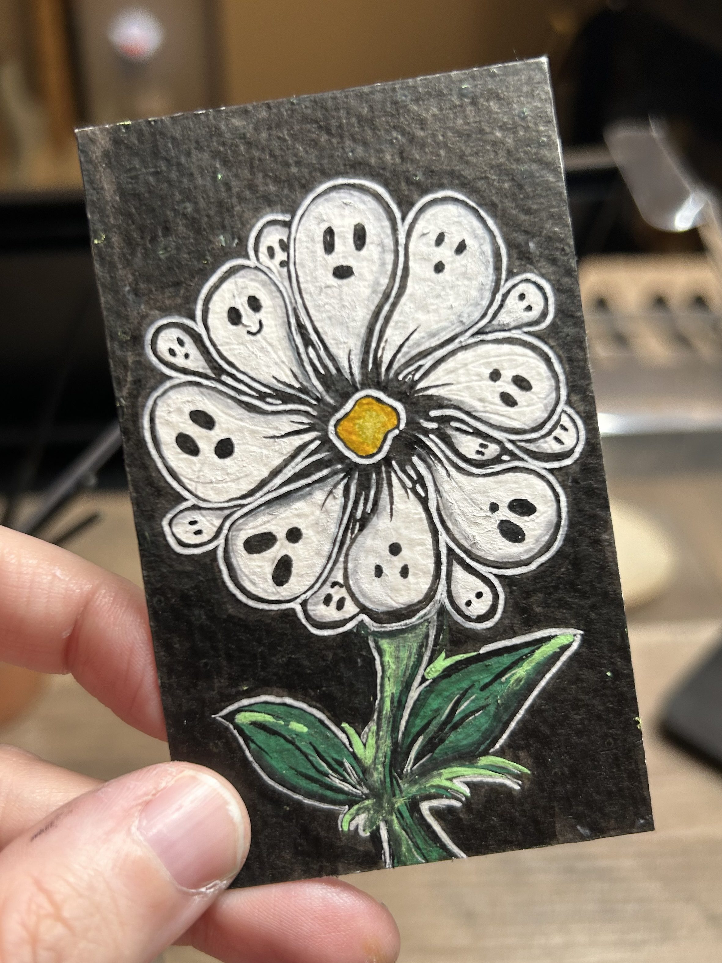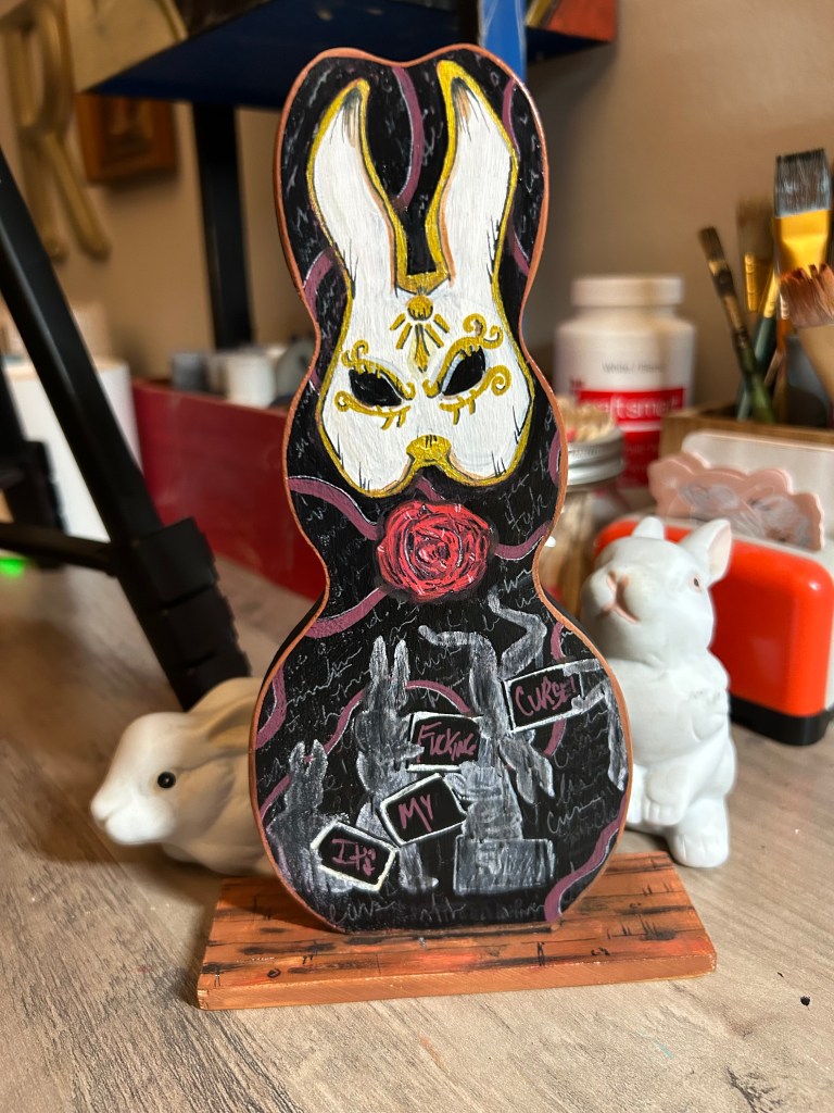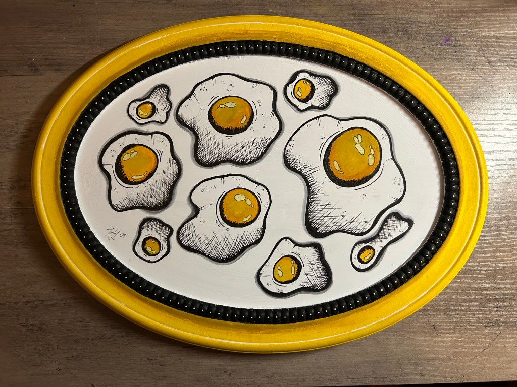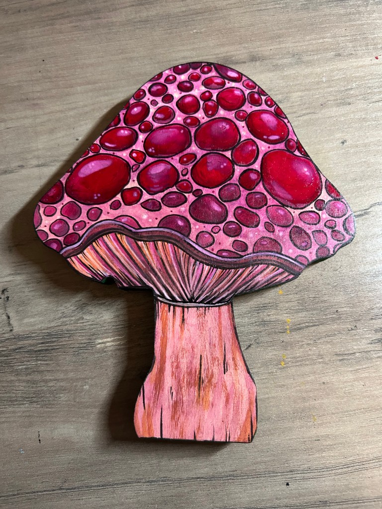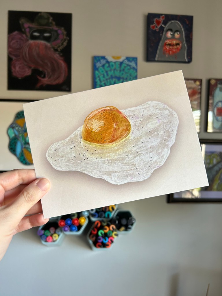 I’m a multidiscipline artist creating pieces inspired by kitsch, spooky, cartoon, and retro aesthetics. The entire point of my artistic journey is ease and whimsy. I paint and draw to create joy, utilize nostalgia, and have plain ol’ fun on hard days. It’s been an incredibly successful endeavor on that last point, which I’m immensely grateful for.