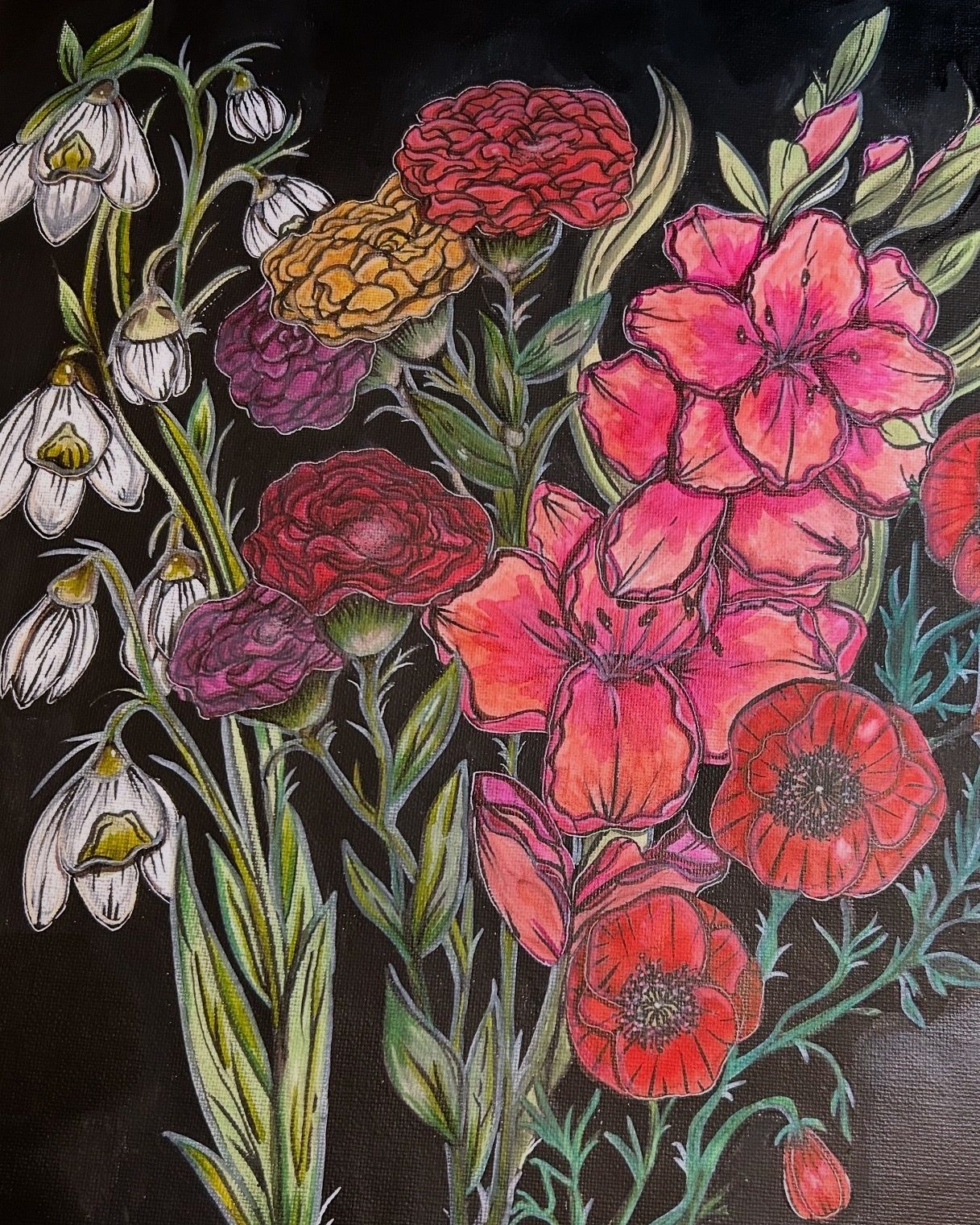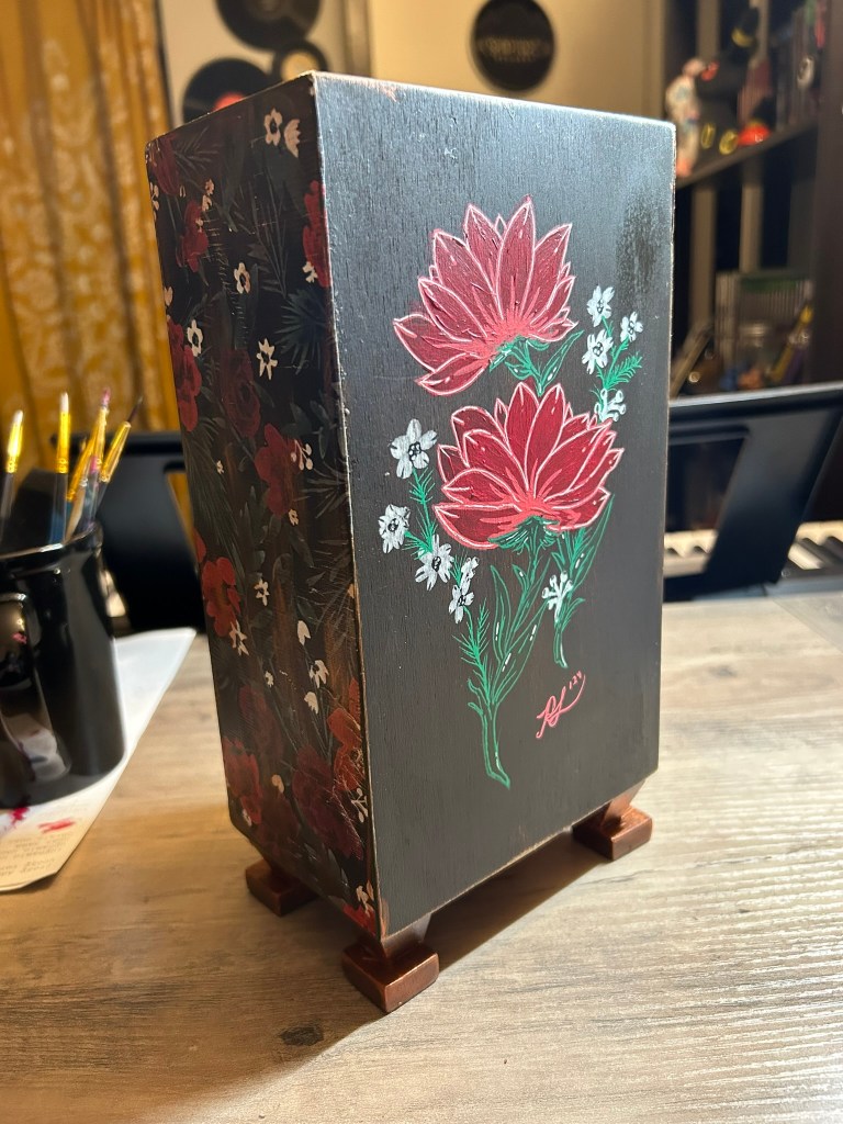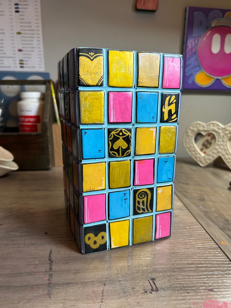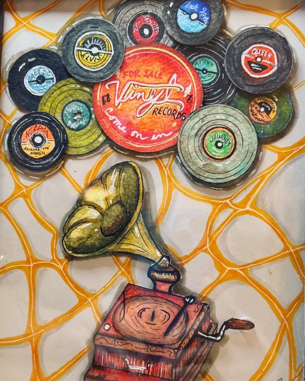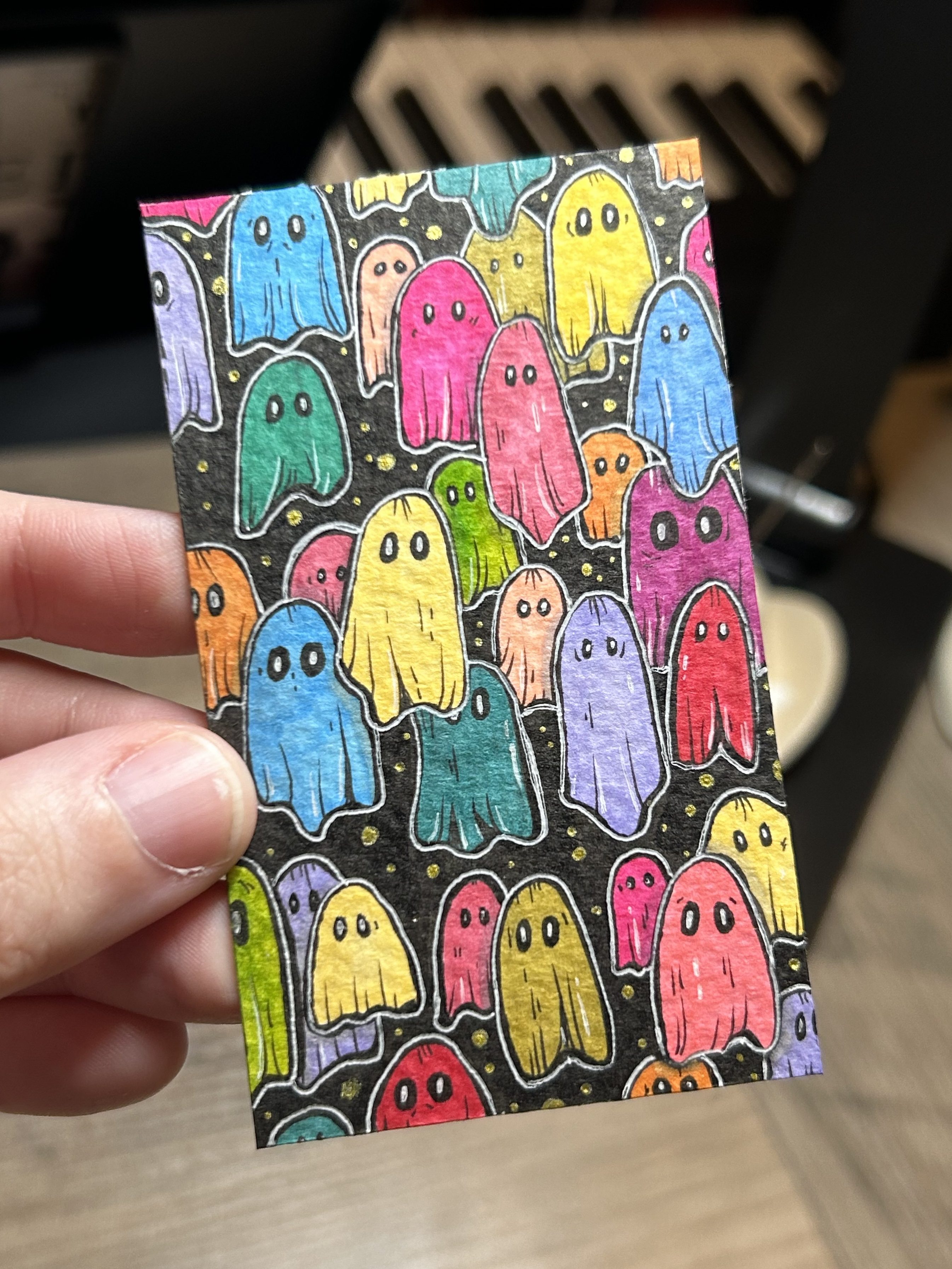 I’m a multidiscipline artist creating pieces inspired by kitsch, spooky, cartoon, and retro aesthetics. The entire point of my artistic journey is ease and whimsy. I paint and draw to create joy, utilize nostalgia, and have plain ol’ fun on hard days. It’s been an incredibly successful endeavor on that last point, which I’m immensely grateful for.
